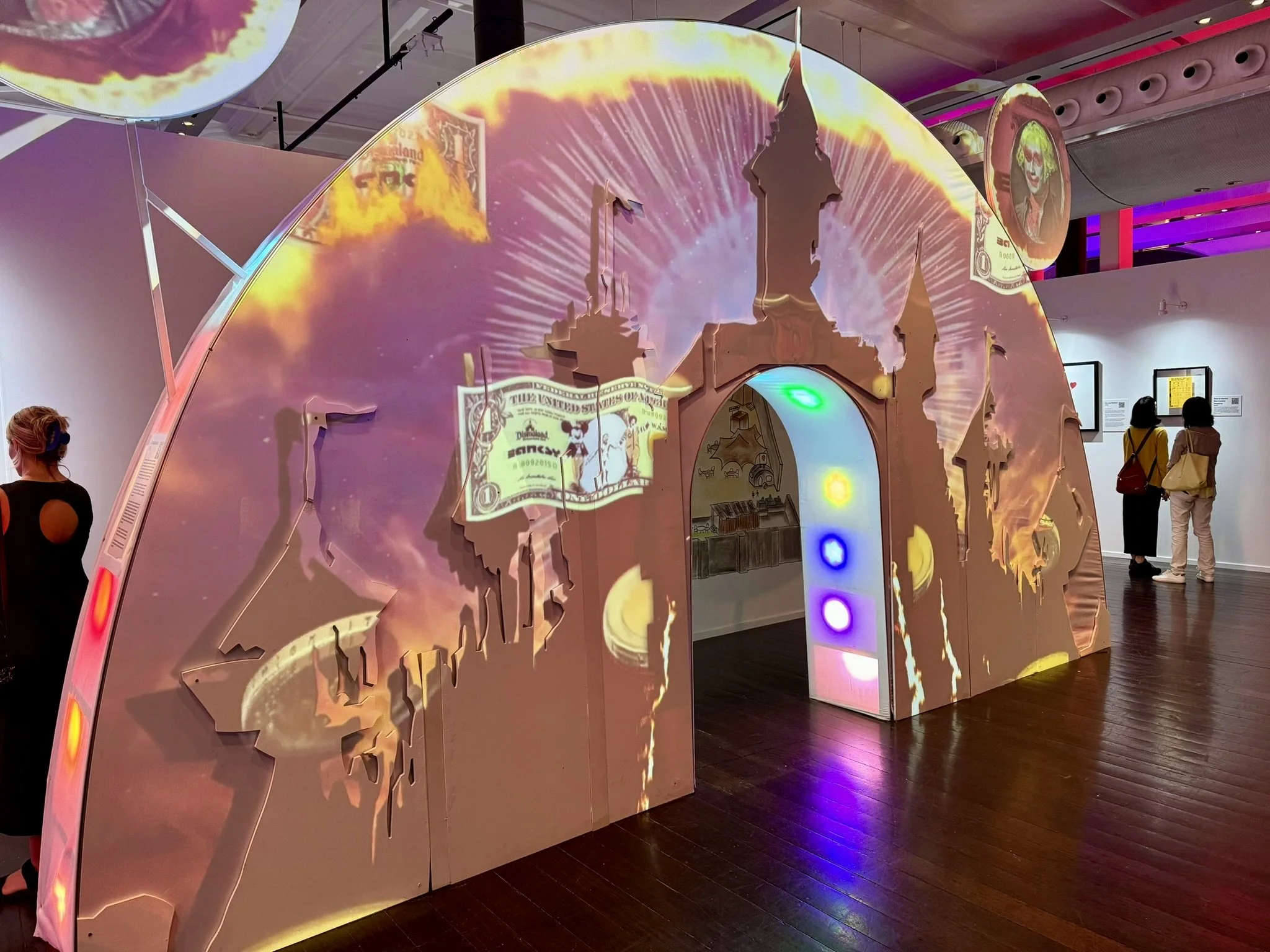 That exhibit with the curved doorway and the dollar bill is a rendering of Dismaland, a temporary theme park and art show in Weston-super-Mare, England, which he described as “a family attraction that acknowledges inequality and impending catastrophe.”